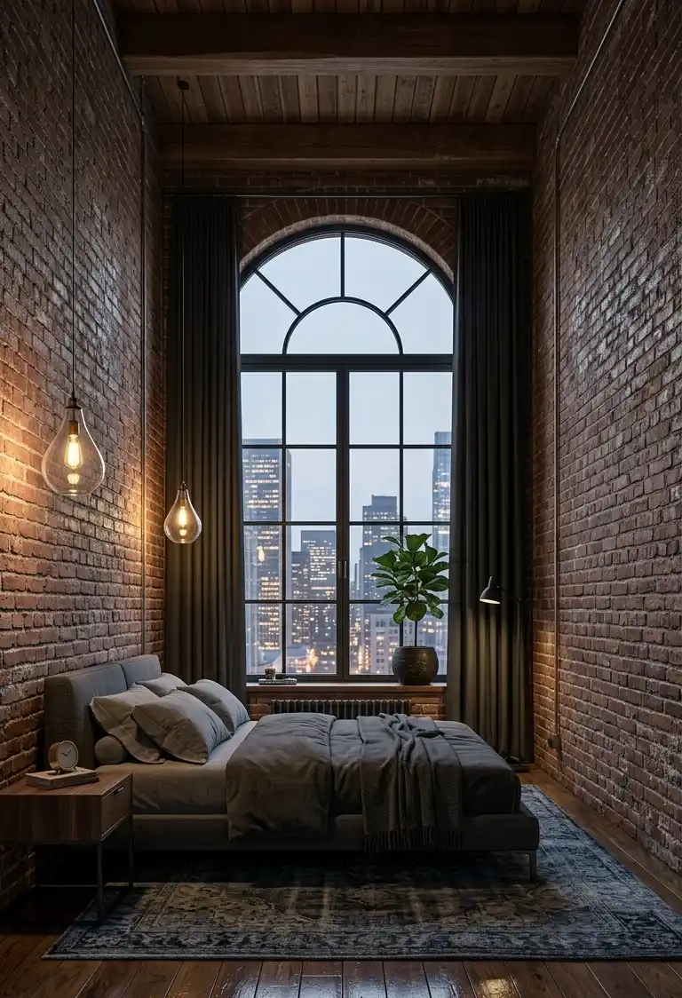 Urban Fenestration Design: Luxury Dark Industrial Bedroom Style with Arch-Top Steel Windows and Timber Flooring