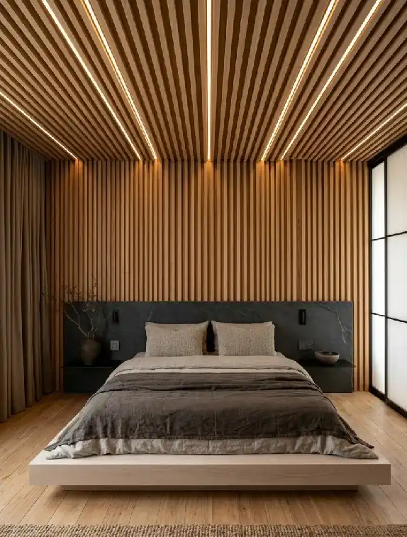 Vertical Slat Integration in a Japandi Bedroom Idea