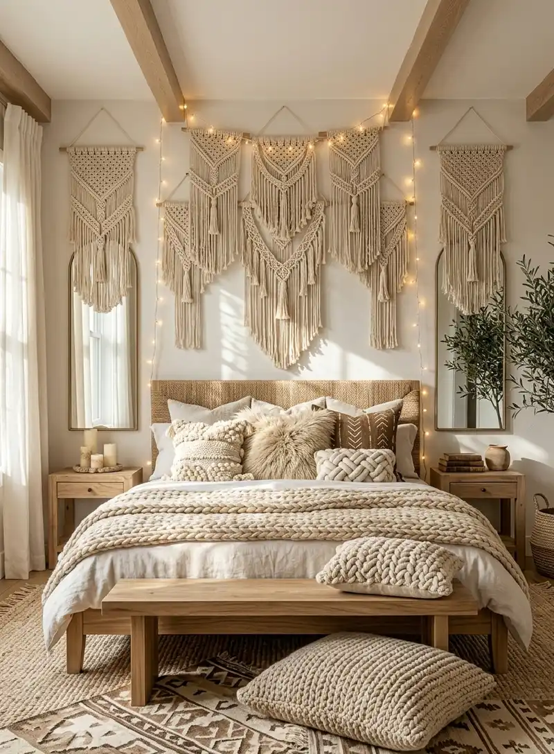 Verticality and Rhythmic Patterns in Boho Chic Bedroom Ideas with Macramé Walls